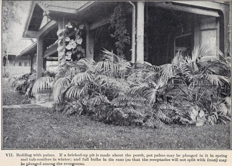 He converted the second floor of the carriage house into a publishing office for the magazine Country Life in America, which he began editing when it was launched in 1900, and an herbarium, which he would later name the “Hortorium,” the world’s first herbarium focused on horticultural collections. The greenhouses have long since been demolished, but the home still stands in Ithaca and is rented by Cornell University to a property management company as student housing. The historical integrity of the house that Bailey and Martin designed has been well preserved, whereas the carriage house is fully renovated, and a local gardener manages several flower plots behind the house in Bailey’s honor. Below, you can see a photograph of the front porch, surrounded by a seasonal bedding of palms. In his retirement, Bailey became deeply interested in the palm family, eventually becoming one of the world’s leading experts on palm taxonomy. The greenery he selected to surround his house no doubt changed greatly from year to year.