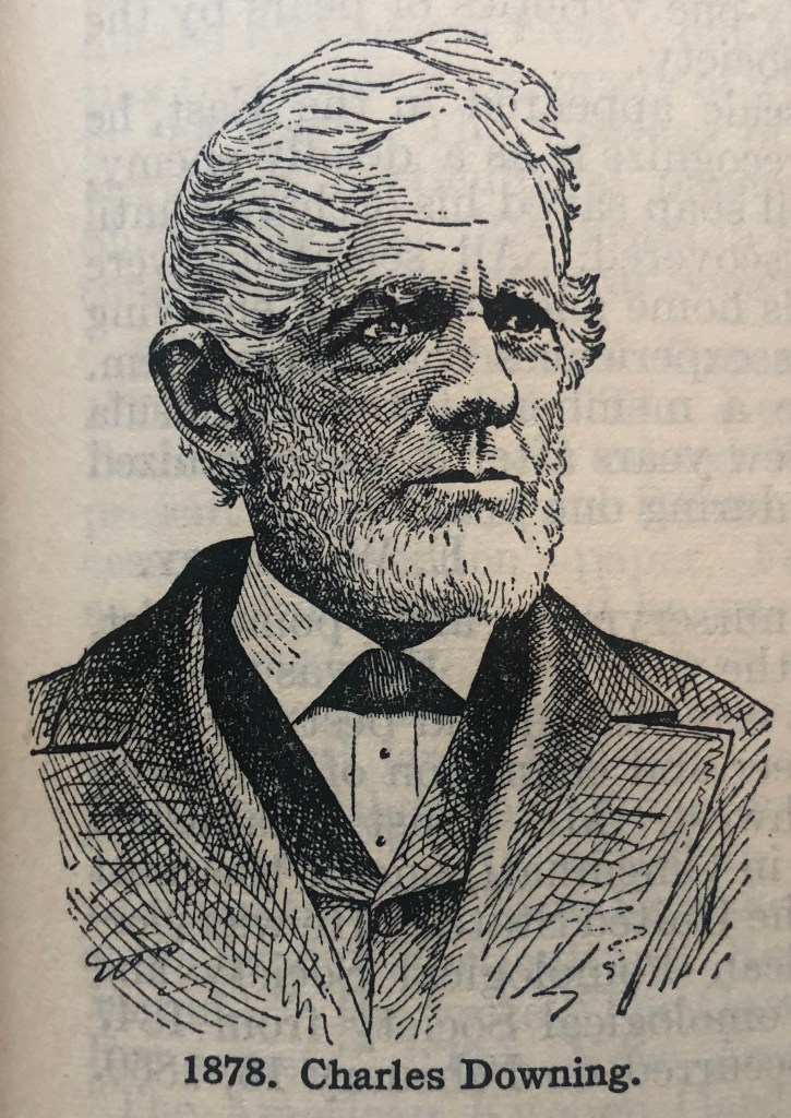 “Downing, Charles (Fig. 1878), distinguished pomologist and elder brother of Andrew Jackson Downing, the landscape gardener, was born at Newburg, New York, July 9, 1802. He was educated at the local academy, and from the age of thirteen to eighteen worked part of the time in his father’s nursery. At the age of twenty he started in the nursery business on his own account. From 1834 to 1839 his brother Andrew was a partner in this business. About 1850, he sold out his nursery business and devoted himself to the study of varieties of fruits, on which subject he was the leading authority until his death. The ‘Fruits and Fruit Trees of America‘ is the monumental American work on varieties of fruits. The book was projected by Andrew, but the great bulk of the work was done by Charles in continuing and revising it. His test orchard contained trees and grafts of 1,800 varieties of apples, 1,000 pears, and other fruits in proportion. In 1896 a city street was put through it. Charles Downing was very modest and retiring. He would never make a public speech, but he wrote many pomological articles over the signature ‘C. D.’ All his work is marked by conscientious accuracy. He died January 18, 1885.” -Wilhelm Miller, in The Standard Cyclopedia of Horticulture (1914-17), edited by L. H. Bailey, Popular Edition, vol. II, 1947, p. 1573