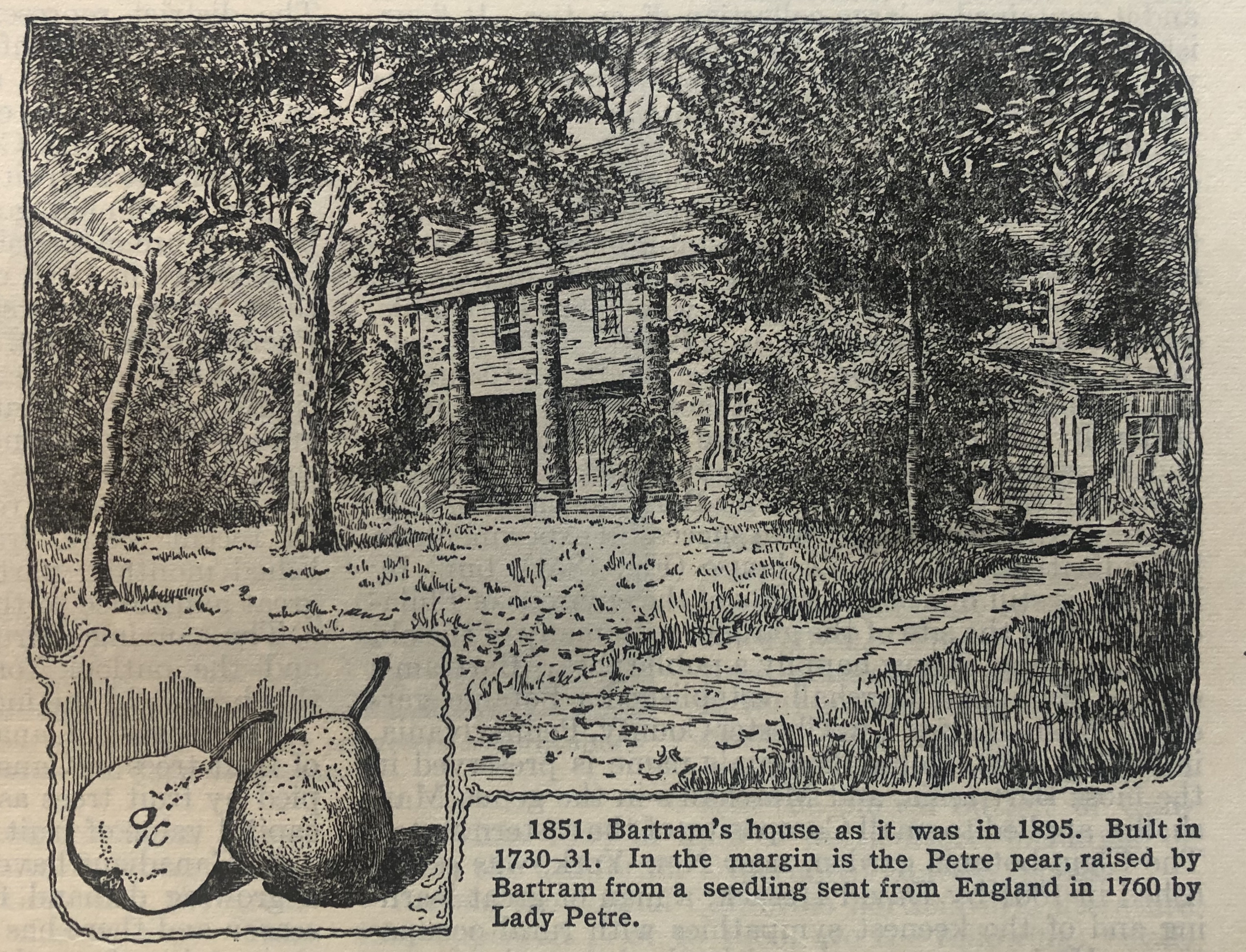 “In 1760 John Bartram planted in his garden on the Schuylkill a pear tree sent from England by Lady Petre; more than one hundred and twenty-five years later I took cions from the tree and set them in a young pear of my planting, and the tree is still fruitful.” –LHBGC, p. 149