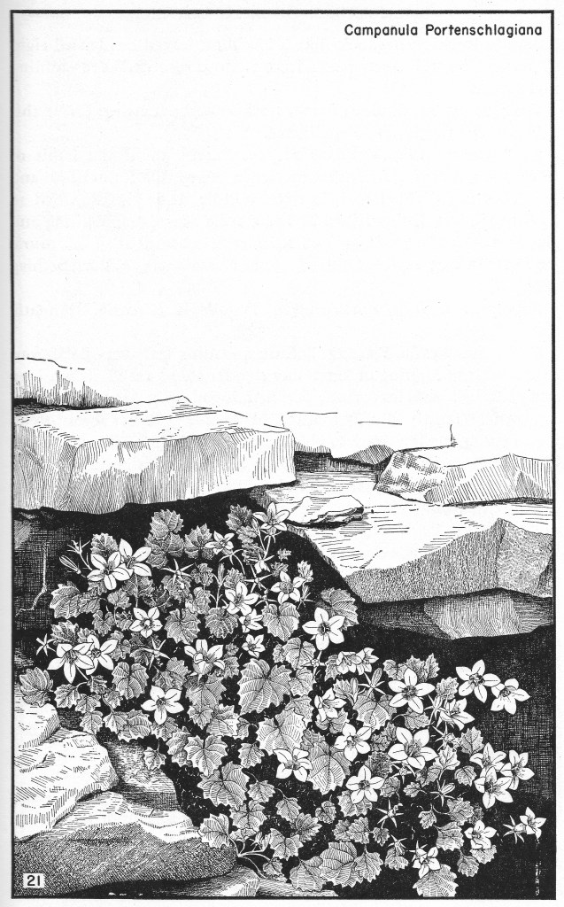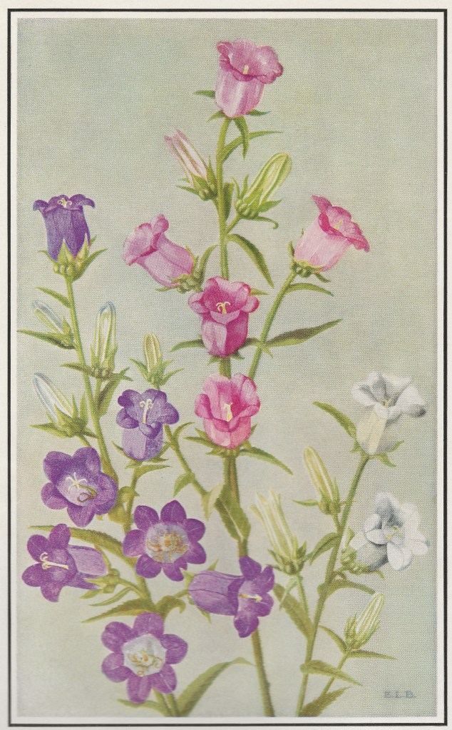 “[Bellflowers] are for those who love to grow plants for the joy of growing them, who respond to the subdued and delicate tints in flowers, who like small but shapely seed-pods, who may treasure them on their own rear grounds and do not go to the shows for exhibitional effects and masses of color. […] Most of the bellflowers I do not discover from the highway or glint them from an airplane. I must go to see them where in complacency they grow.” –The Garden of Bellflowers (1953), pp. 2-3