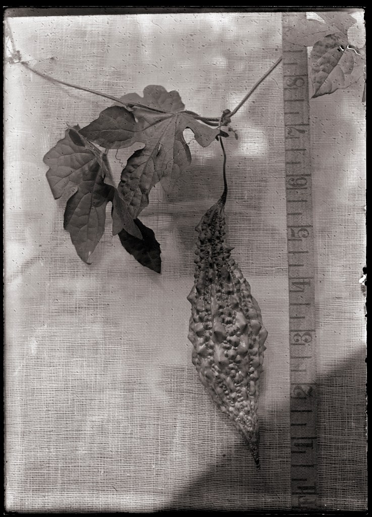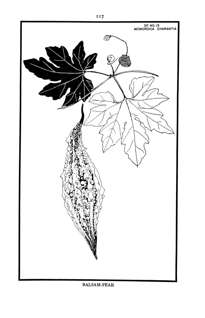 In 1936, a seventy-nine-year-old Bailey wrote, “my technical and scientific writings on the Cucurbits began nearly fifty years ago; and now, as the years are ripe, I wish to express my joy in the experiences.” That joy led to the first of his series of “Garden Books,” each based on a different family of plants that he had grown and collected for many years, exploring them through the personal and artistic experience of the garden as well as through the methodical science of taxonomy. The cucurbits, or gourd family, include a wide variety of horticultural plants, including melons, cucumbers, pumpkins, squashes, and the hard-shelled fruits that are more commonly called gourds. Bailey’s many “technical and scientific writings” contributed significantly to making taxonomical sense of the large family. The photograph at left, of a gourd known as the balsam-pear, was taken by Bailey, likely of a specimen from his garden at Sage Place, and it was clearly used as the model for the corresponding illustration in The Garden of Gourds, seen below.