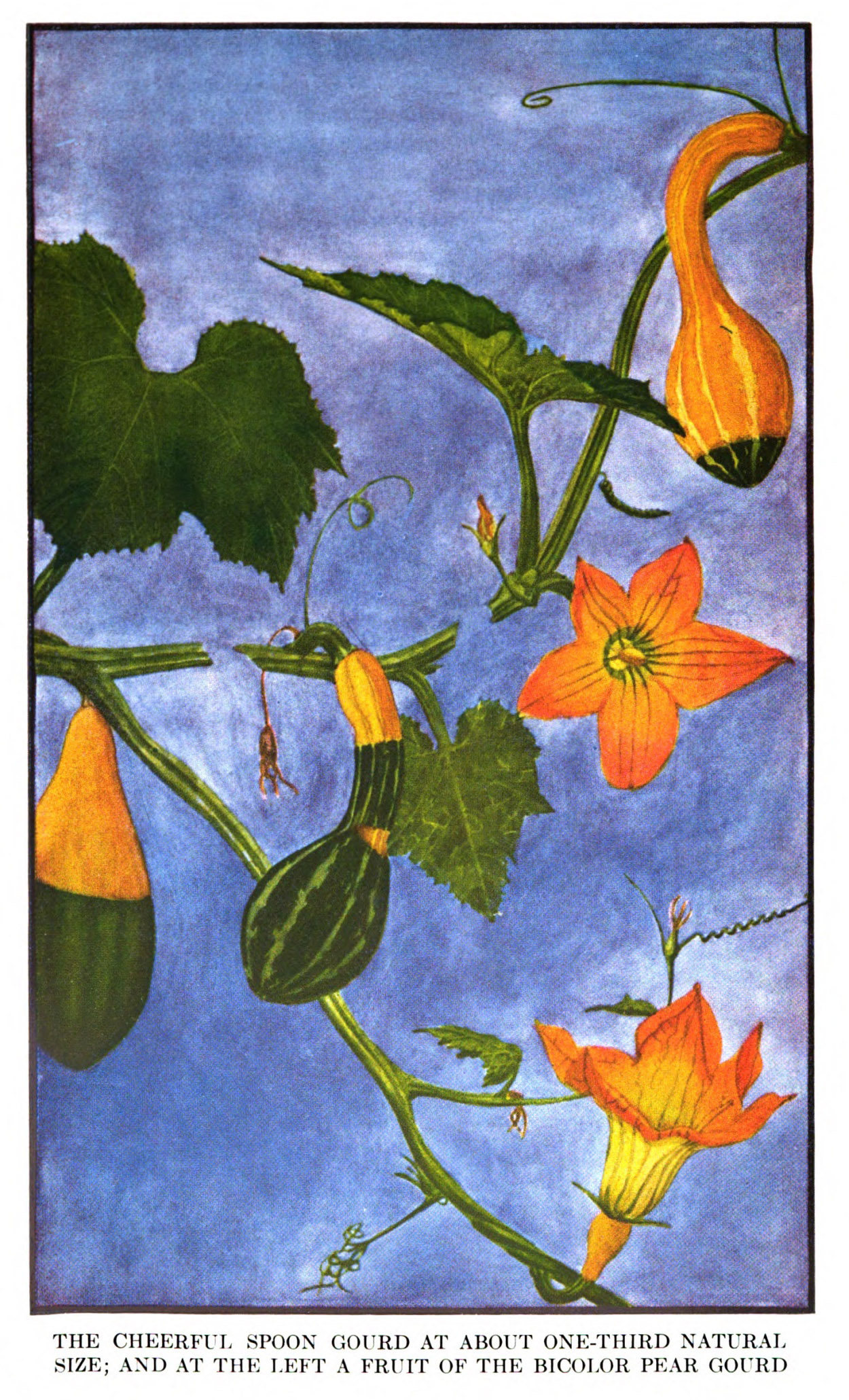 “It is the first day of October. Summer birds are gone. Frosts have signaled for winter. All tender vegetables are harvested from the garden. Marigolds and zinnias and a few other rugged things still retain the glow of warm weather, yet the autumn chill is in the air, new colors are on the hills, dead leaves begin to cover the grass. […] Yet even now the gourds hang on the trellises, and although blossoms are mostly gone and leaves have passed their prime, the bright green-and-yellow striped fruits in comely attractive form ask for attention. Probably every year since my youth—and that was long ago—I have grown gourds of one kind or another and sometimes of many kinds. I have made an herbarium collection of them, for record, including foliage and flowers; and many fruits lie in boxes. I cannot remember when I did not know them.” –LHBGC, p. 183