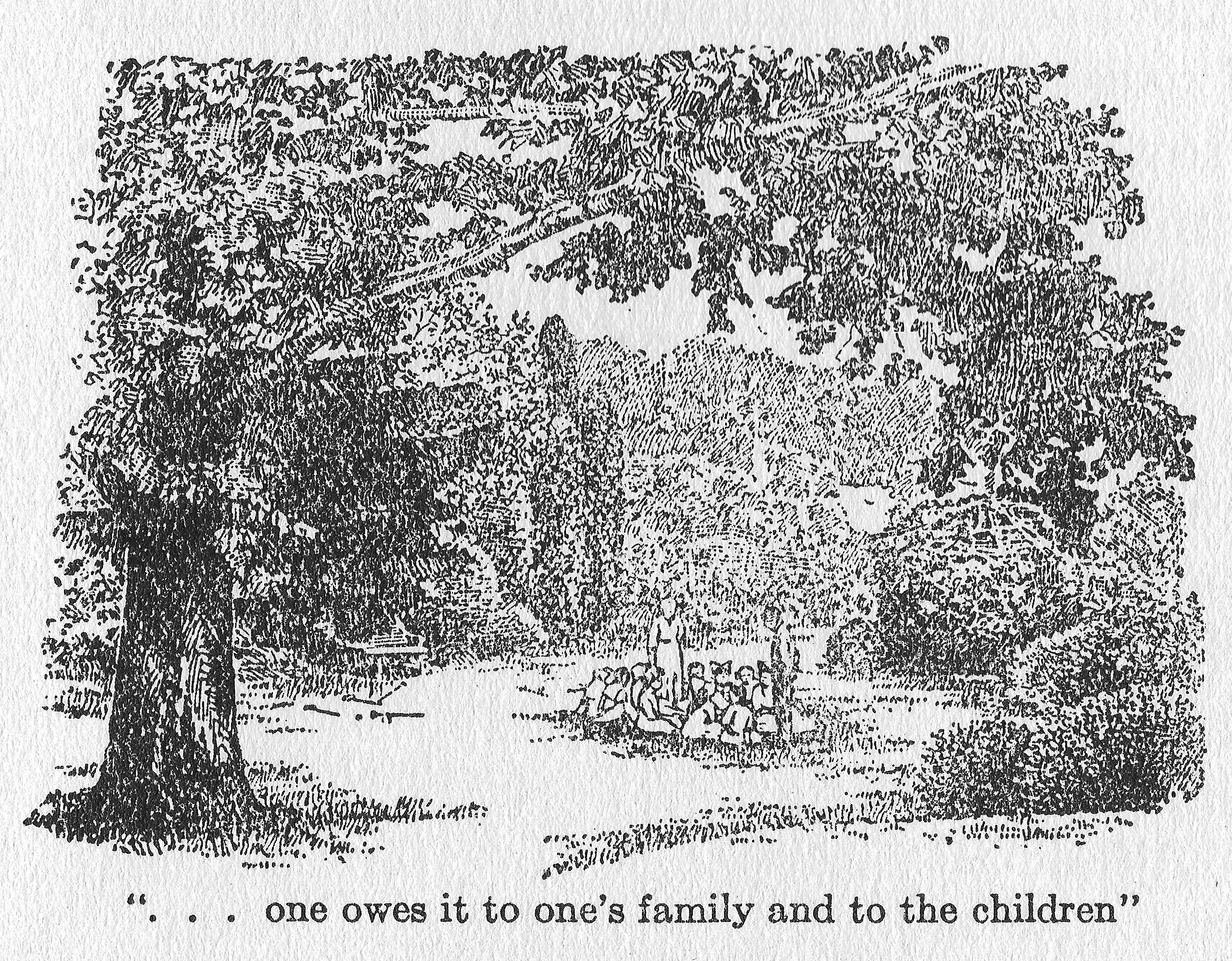In his work as a pioneer in the field of landscape gardening (known today as landscape architecture), Bailey was familiar with the term “background” in terms of the design of a home or garden, as in the illustrations of “a house” and “a home” at the bottom of the previous page. As the years passed, however, that word “background” began to take on a new meaning in his writings. In the early 1900s, as he grew to national prominence as a leader in both the nature-study movement and country life movement, he became invested in the philosophical project of helping people redirect their attention away from what seemed to him like some of the more superficial distractions of modern consumerism and back toward the natural world and our place in it. He was far from anti-modern, but he believed that humans and everything involved with civilization were still part of nature, and that losing track of that fact would cause people to lose their way in life. Notice in the illustration above how the trees and shrubs form a background for the conversation happening with the children—the landscape gardening here helps to frame the conversation and thought process of the gathering. You imagine that the conversation can’t help but be influenced by the songs of birds in the trees, by the insects whirring by, and by the breeze rustling through high tree branches.