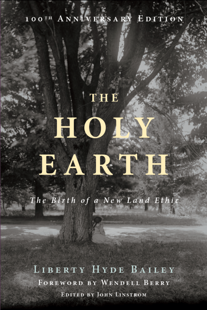 On the right, you will see the cover of the centennial edition of The Holy Earth, which features a photograph, taken by Bailey and now part of the collection of the Liberty Hyde Bailey Museum & Gardens, depicting his daughter Sara leaning against a tree at the old farm in Michigan, her attention drawn along a line of trees to the background of the picture and the whispers of wind through the distant leaves.