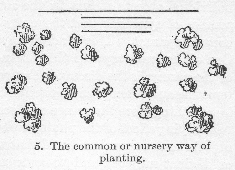 This nature-love would manifest itself in the design of the garden and the home. Bailey believed that good garden design, or “landscape gardening,” should imitate the free and easy dispersal of plants found in undisturbed natural areas. He disliked the then-common practice of growing individual plants as showpieces scattered about a front lawn, as seen in an illustration from his Manual of Gardening at the left. The illustration below, by contrast, depicted his ideal, of plants arranged into a cohesive picture, symbolizing the ways they grow together in the wild, but arranged in a way that makes sense to the human eye.
